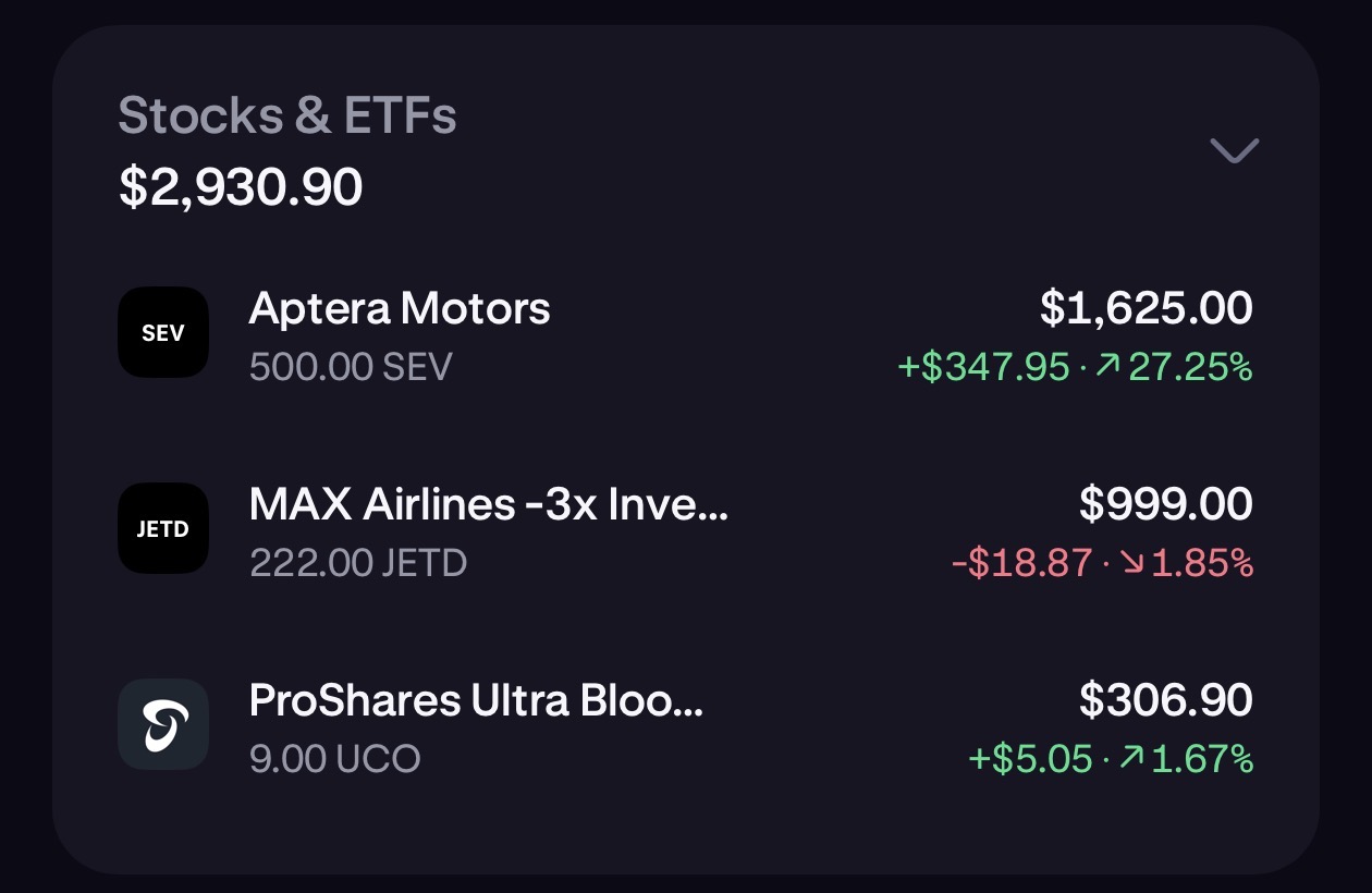 Aptera makes up 50% of my degenfolio, and the other half is a leveraged 3x short on the airlines via JETD and a small 2x oil long via UCD. None of you tards actually went long over the weekend did you. I was mildly concerned these idiots might make peace over the weekend, but of course they’re too stupid for that, so looks like Monday will print again.