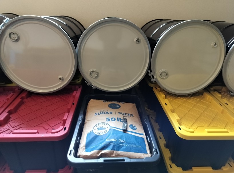 Why are you storing oil on top of the sugar? If the barrels leak the sugar is ruined. Clearly a storage safety violation here. Not the sugar thing if it for yourself. But how you are storing oil. You are going to get hit hard by an environmental safety inspector. Health inspector too if you plan to sell the sugar.
