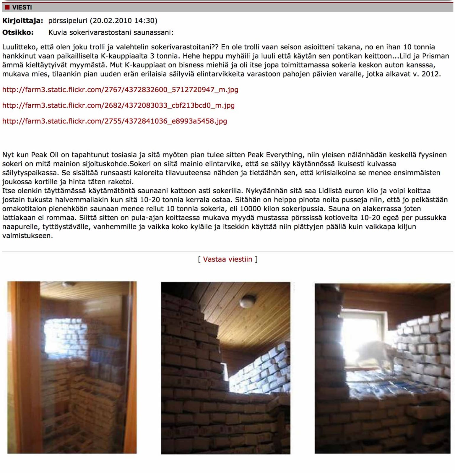 Some Finnish guy bought multiple tons of sugar and stored in his sauna for peak oil and the inevitable 2012 armageddon.
