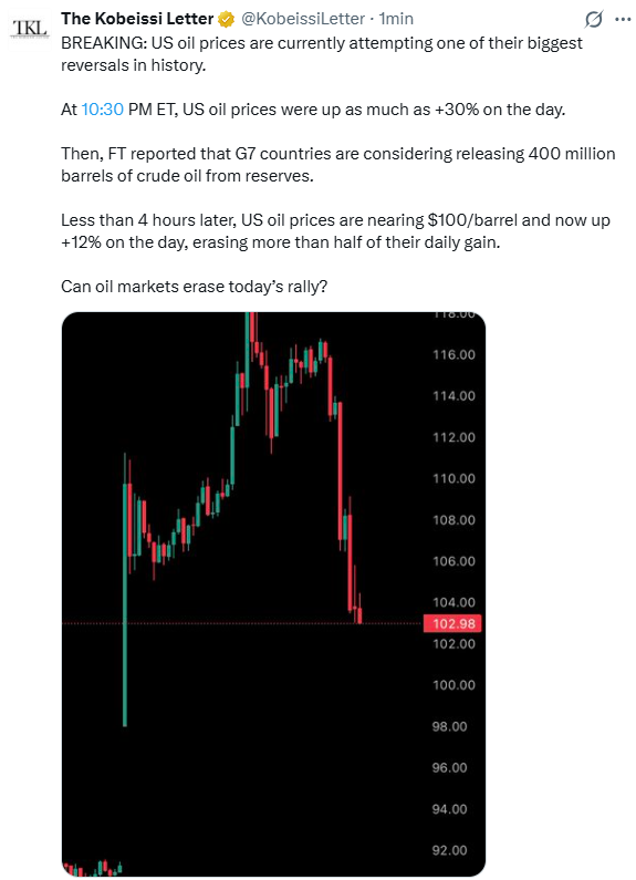 >>61953183All three were at $103 at open for one some reason. I suspect somebody dumb just wanted to buy any oil for under $103 without thinking about which location they bought.This brings me to the question of why Murban Crude is still being bought. If you have to get it delivered you have to figure out a way to get it out of the gulf.Whoever bought it all for $103 might not have been thinking about transport.