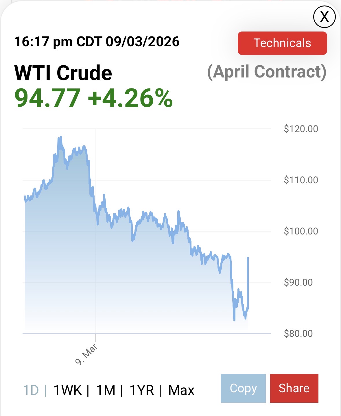 Has oil ever moved so much in one day?I wonder how many people blew up. Probably some Japanese trading house did something very dumb.