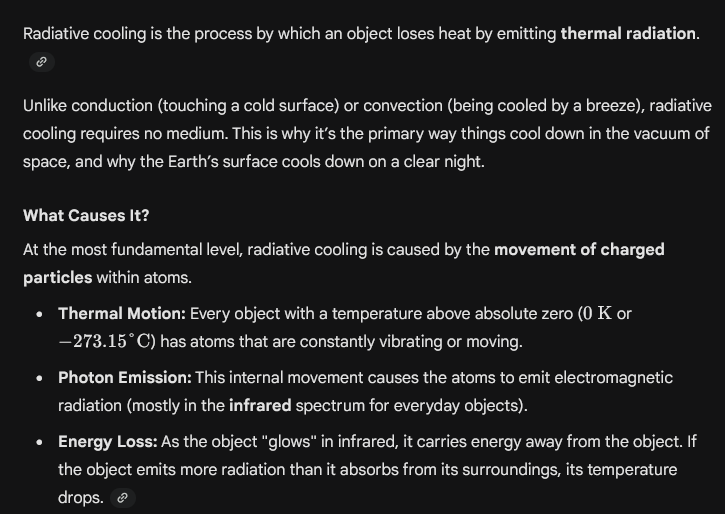 >>61960467legit. it seems crazy but heat just radiates off of things out in space, as infrared light. does here too i guess but all the matter gets in the way and slows it down. in space heat dissipates extremely fast.