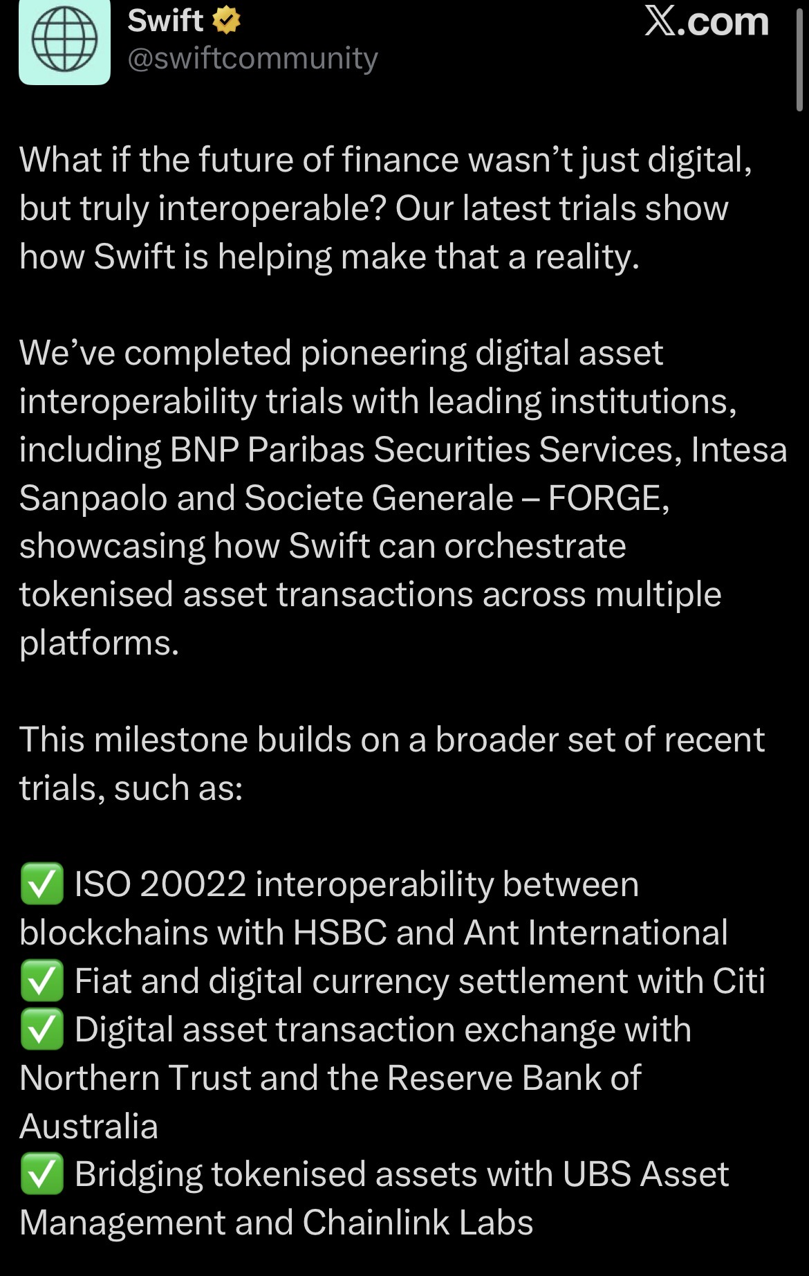 >>619655752024:https://www.swift.com/news-events/news/live-trials-digital-asset-transactions-swift-start-2025What happened in 2025?FUCKING NOTHING