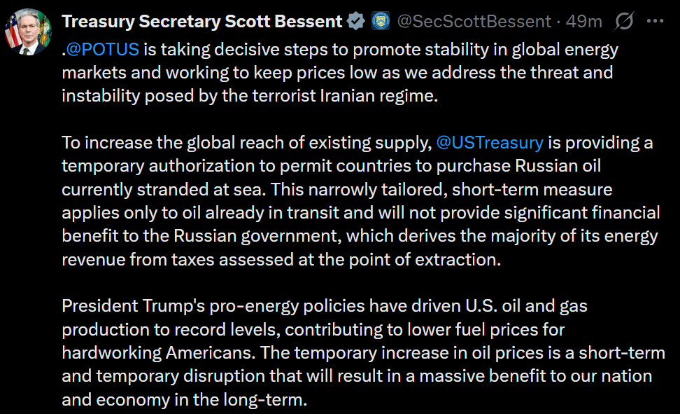 The russian sanctions only apply to oil loaded before march 12th apparently. Can't see it taking up any slack.