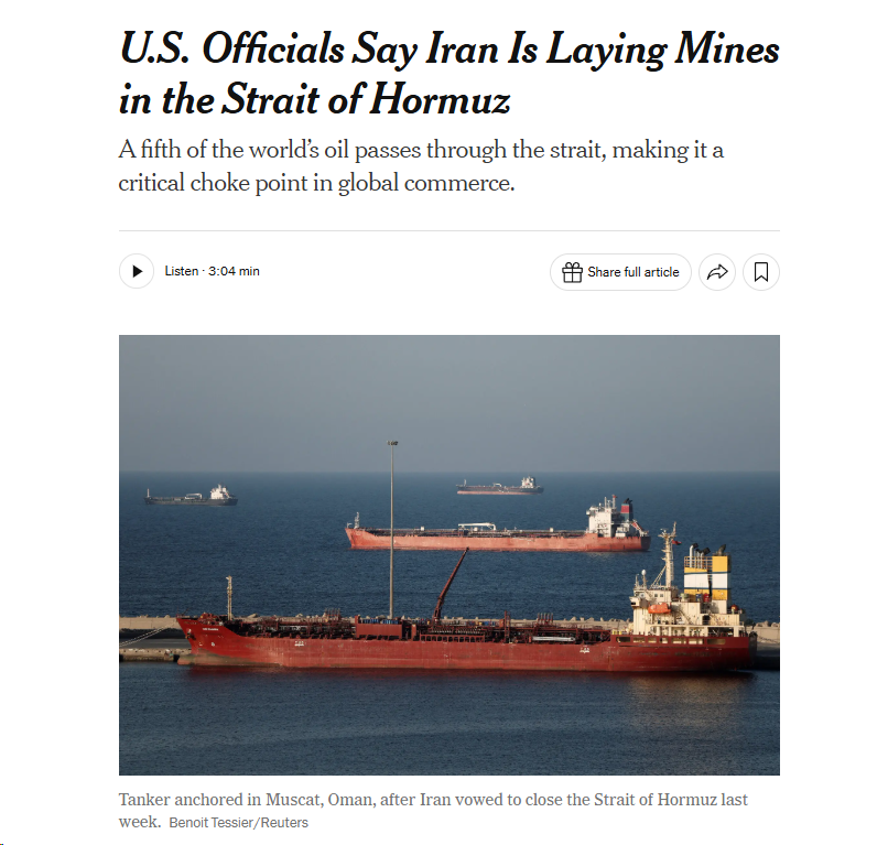 >Le … le mine threat!Just let two drone ships steam ahead of the oil tankers and absorb the mines.When do I get the offer by Palantir for my military and economical intelligence?