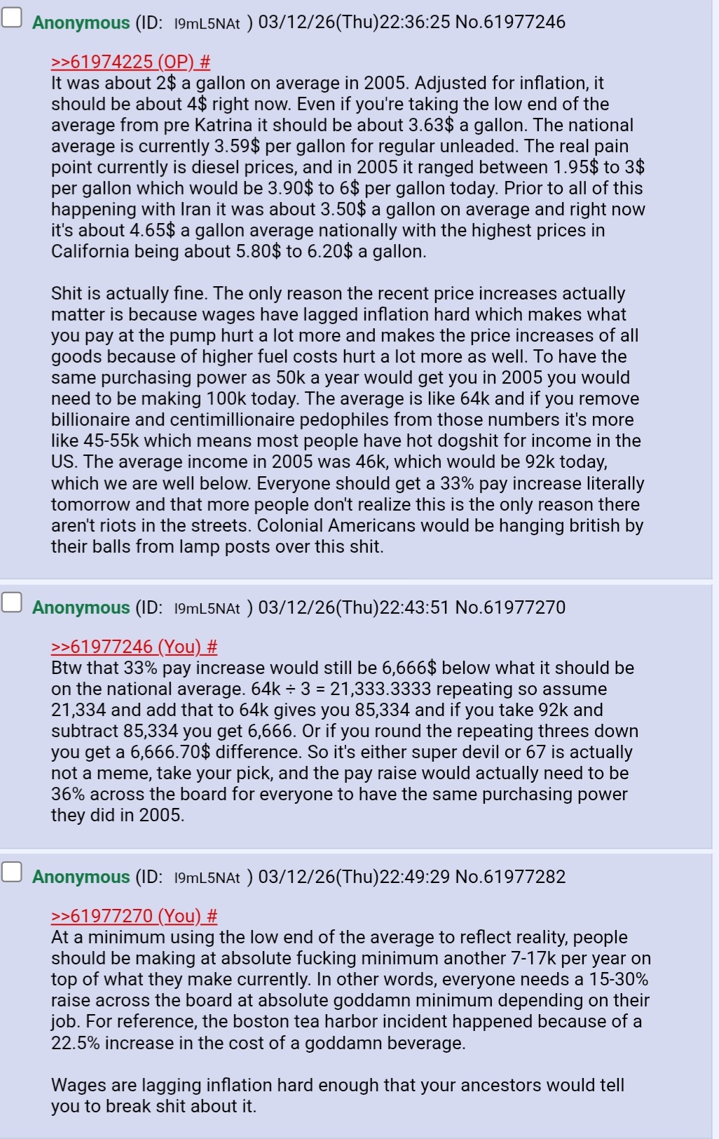 >>61977645>>61977660>>61977689>>61977690>>61977691>>61977693>This price reflects the premium for a physical cargo over the paper price and has surged from just 84 cents a barrel on February 27, the day before the U.S. and Israel attacked Iran.>It's a similar story for jet kerosene , with spot prices hitting a record high of $225.44 a barrel on March 4, before retreating to end at $157.12 on Wednesday, but this price is still 68% above the $93.45 on February 27.>What the prices in the physical crude and product markets in Asia are saying is that the supply chain is buckling and the situation will likely get worse as countries start to hoard crude and fuel.