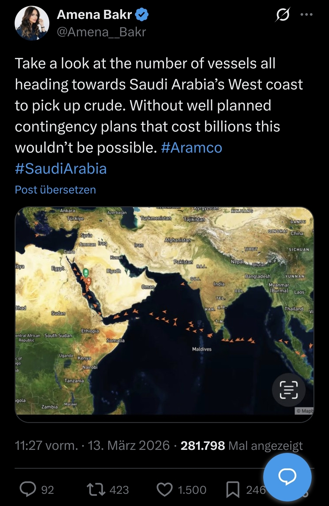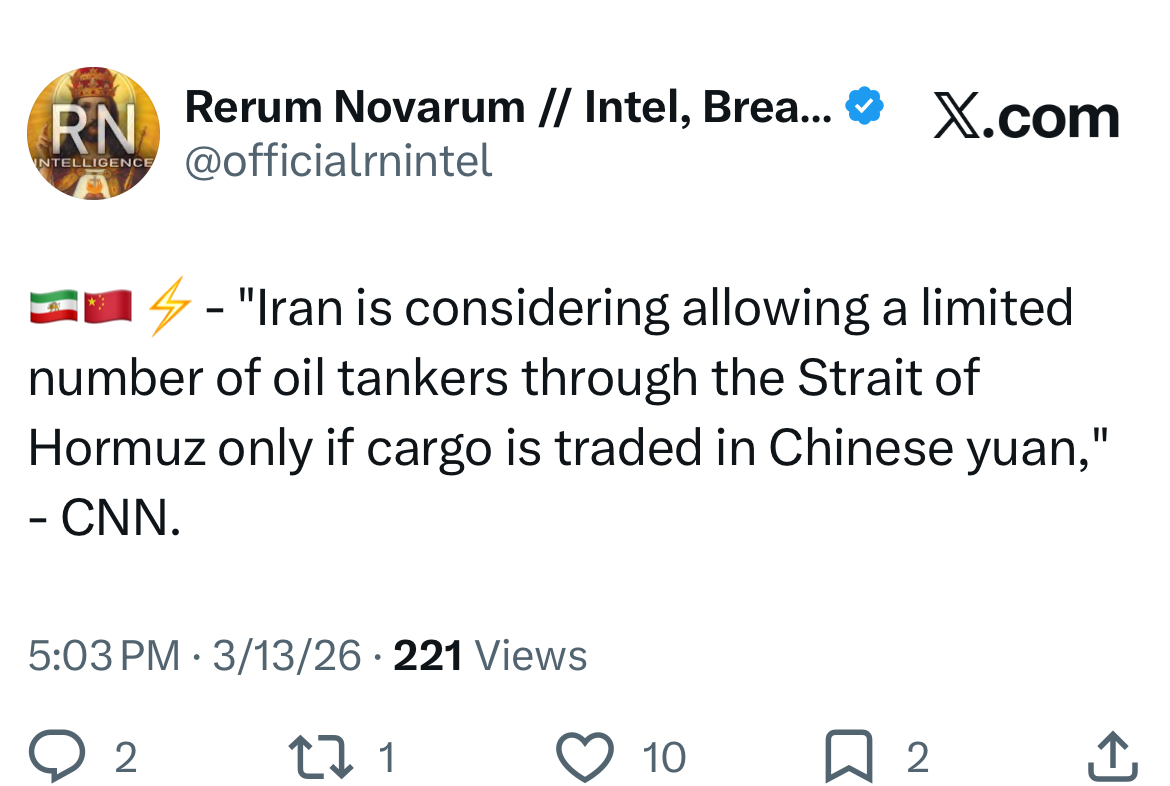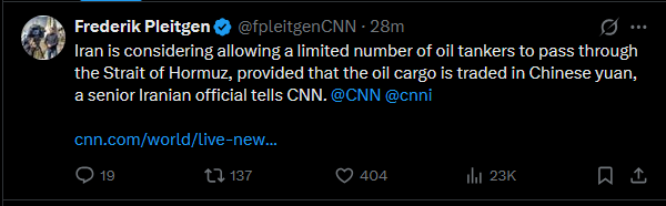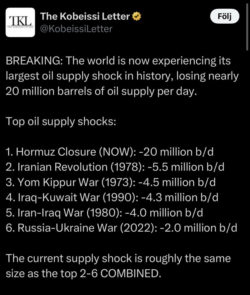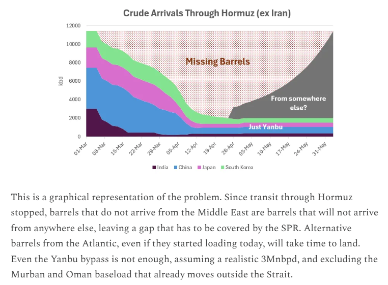 I found this chart interesting, because we are still very, very early on the timeline.Korea and Japan are still scheduled to receive Hormuz-loaded barrels until like early-mid April.Even if Hormuz reopened today, deliveries would commence where the grey line starts.Every day Hormuz does not reopen, the grey area is moved one step further to the right, creating a massive number of "missing barrels".It's bad.