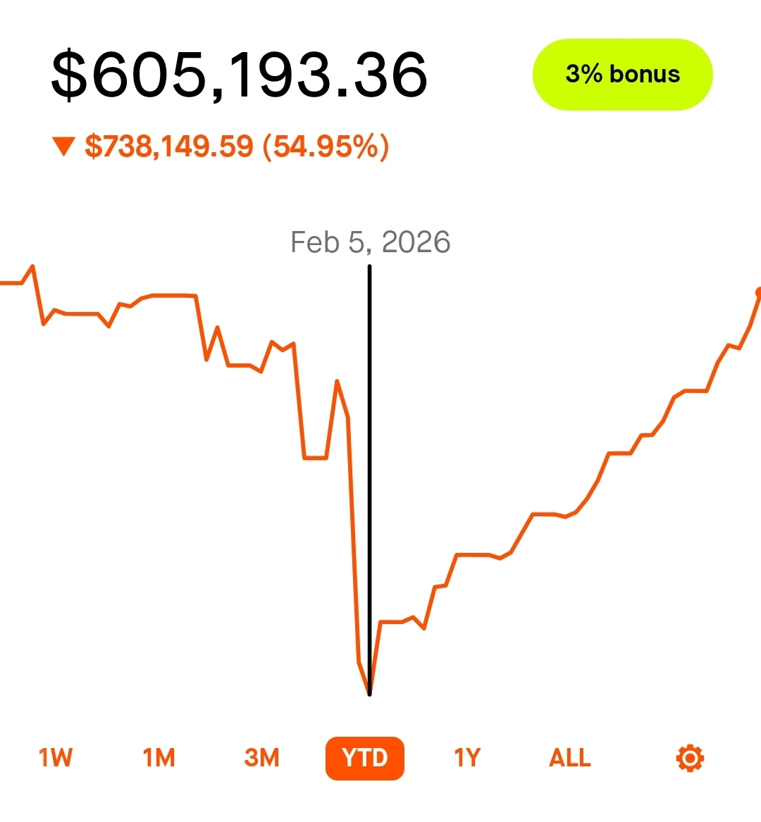 >>61981721I thought I had a fairly foolproof automated strategy and kinda stopped paying attention while I was moving, so I got fucked by the Kevin Warsh nomination crash.Also, I'm not stopping until I hit generational wealth (at least 10mil in today's dollar value).I already have a job that can easily pay for my shit