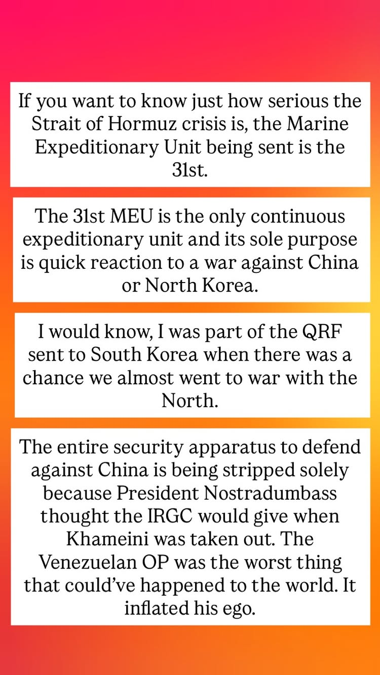 >>61981758Honestly the more I've thought about it, the more I think this war is a solid play by the US, despite my general hatred of drumpfgh. Two major reasons, the first one I believe we've achieved already, and the second is a major gamble. The first is stopping their nuclear program. The initial strikes on Iran makes it clear how much of an irrational actor they are, they are mad dogs that attacked countries that were ostensibly their allies, or at least ranged politically neutral to friendly with, for no real reason in a crazy lash-out. If they ever got working nukes there's no telling when they would've tried launching them at the US, or anyone else for that matter. We've set their nuclear program back, hopefully decades, so we've achieved one victory.The second being the strait of Hormuz. If we were able to completely control the strait, imo we would go back to solidly being the world superpower, no question about it. We would effectively neuter china, and it would be one of the defining moments of the century. It's a gamble because there seems to be a real chance we aren't able to take the strait and install a government amenable to the US in Iran, but with boots on the ground those chances go up a lot. We have stopped the policy of 'speak softly and carry a big stick', and gone to 'scream and yell and smash the stick on the ground every chance we get', which emulates Russia and what Putin has wanted to do, but we actually have the manpower to do so. It'll change the dynamics of how the world sees the US forever, but we are probably strong enough to say 'fuck you' to other countries opinions of us, they'll have to ally themselves to us anyway because we are the undisputed #1. >>61981760I SAID I DO NOT REGRET MY PURCHASE OF HGRAF THE OTHER DAY, DESPITE LOSING MONEY, AND IN FACT I HAVE PURCHASED MORE OF IT BECAUSE I SEE THE VISION
