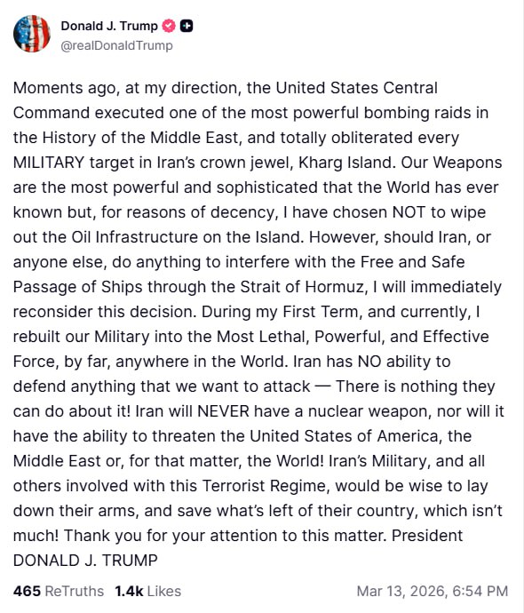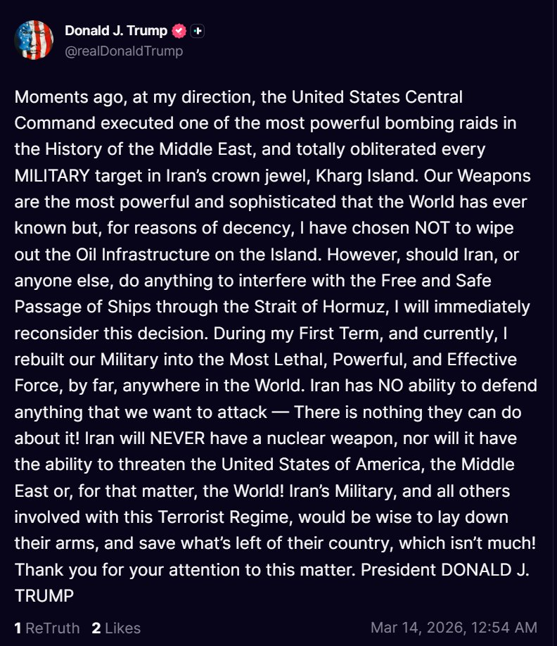 Trump just bombed Kharg Island, aka the processing facility for Iranian oil. He's saying only military targets were hit, but if he's trying to use it as a bargaining chip, expect this to progress for many more weeks.
