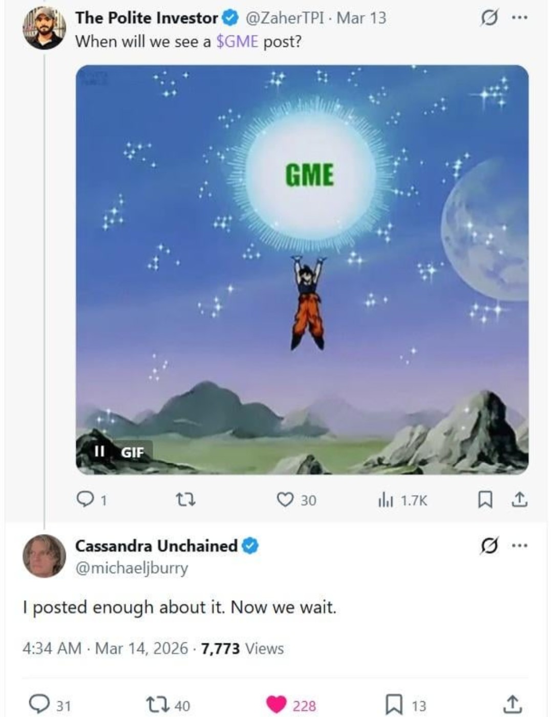 >>61984529>the idiotic shilling yesterday was getting on my nervesMine too. The algo crabbing and shit flinging in the threads is really getting old.>I hope we all WAGMI sooner or later.Me too. People like us with shares that stay the course will be rewarded. Everything we've seen from gme the last few years is confirmation enough that something will eventually break and gamestop will end on top of it all.