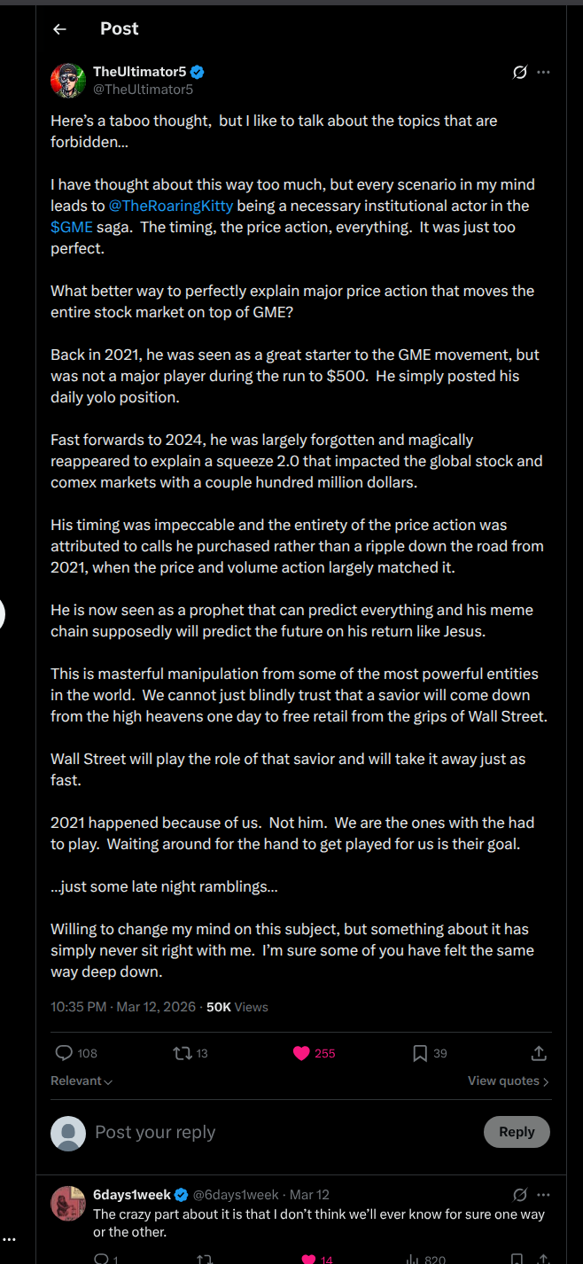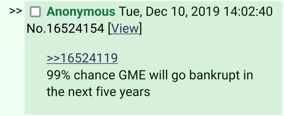 >>61984424Yep. It's been proven countless times that gme doesn't move at all on fundamentals. The stock is illiquid and trading 100% by algos. Yesterday (among many other days) is a perfect example of algorithmic nonsense. The only way for gme to escape algo purgatory is with a massive company transforming catalyst. And I believe that will happen after the price has one final dump.I hope I'm wrong, and even if I am wrong and it squeezes from where the price is I'll still be rich. Hope for the best, prepare for the worst.