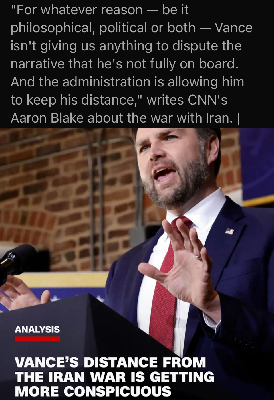 >vance is voicing dissent openlyI hope you guys are paying attention because this is how they will platform him in 2028. Absolve himself of his association with Trump and his policies but also keep the vice president clout. Same thing they tried with Kamala. Don’t forget, JD Vance is a shabbos goy with deep ties to Jewish money