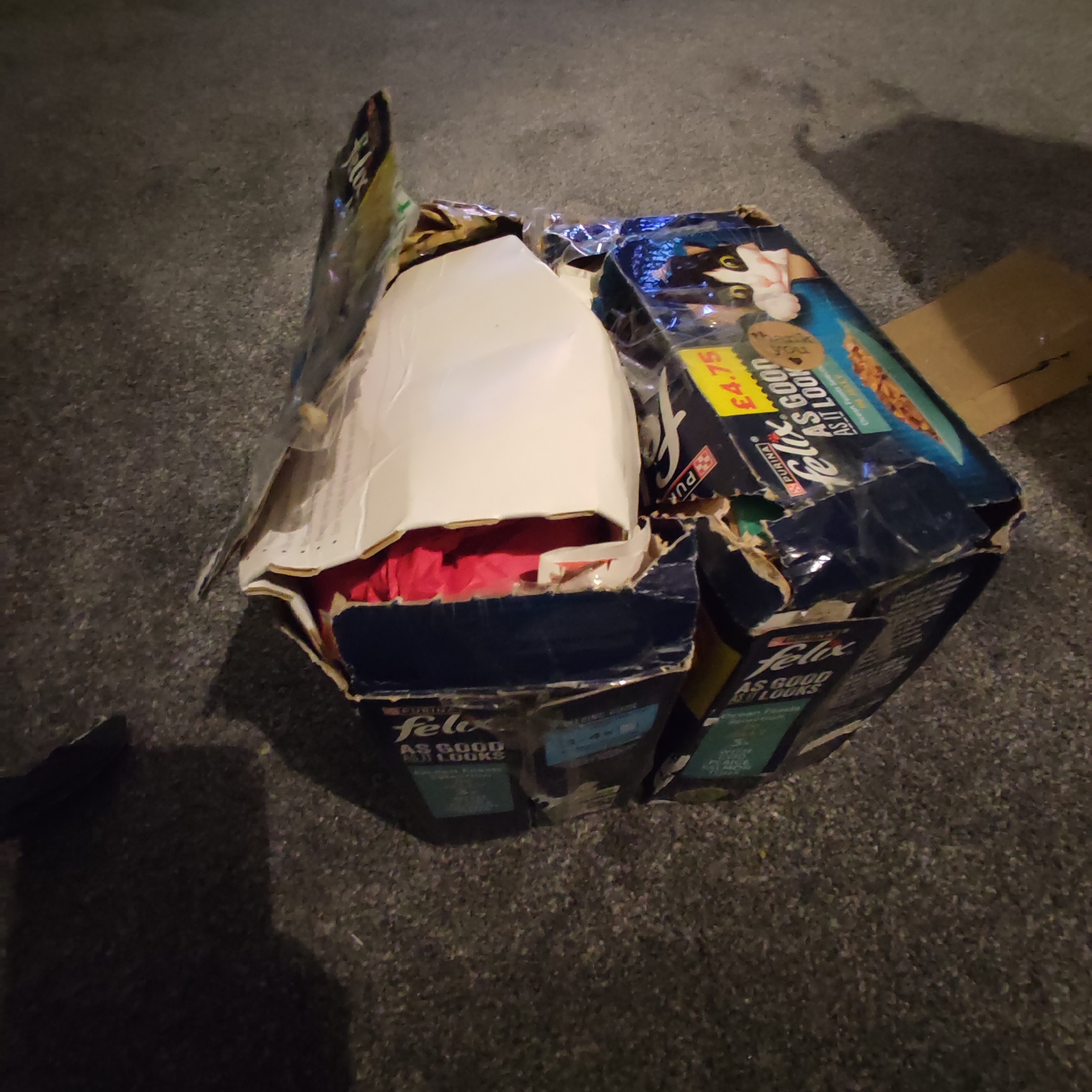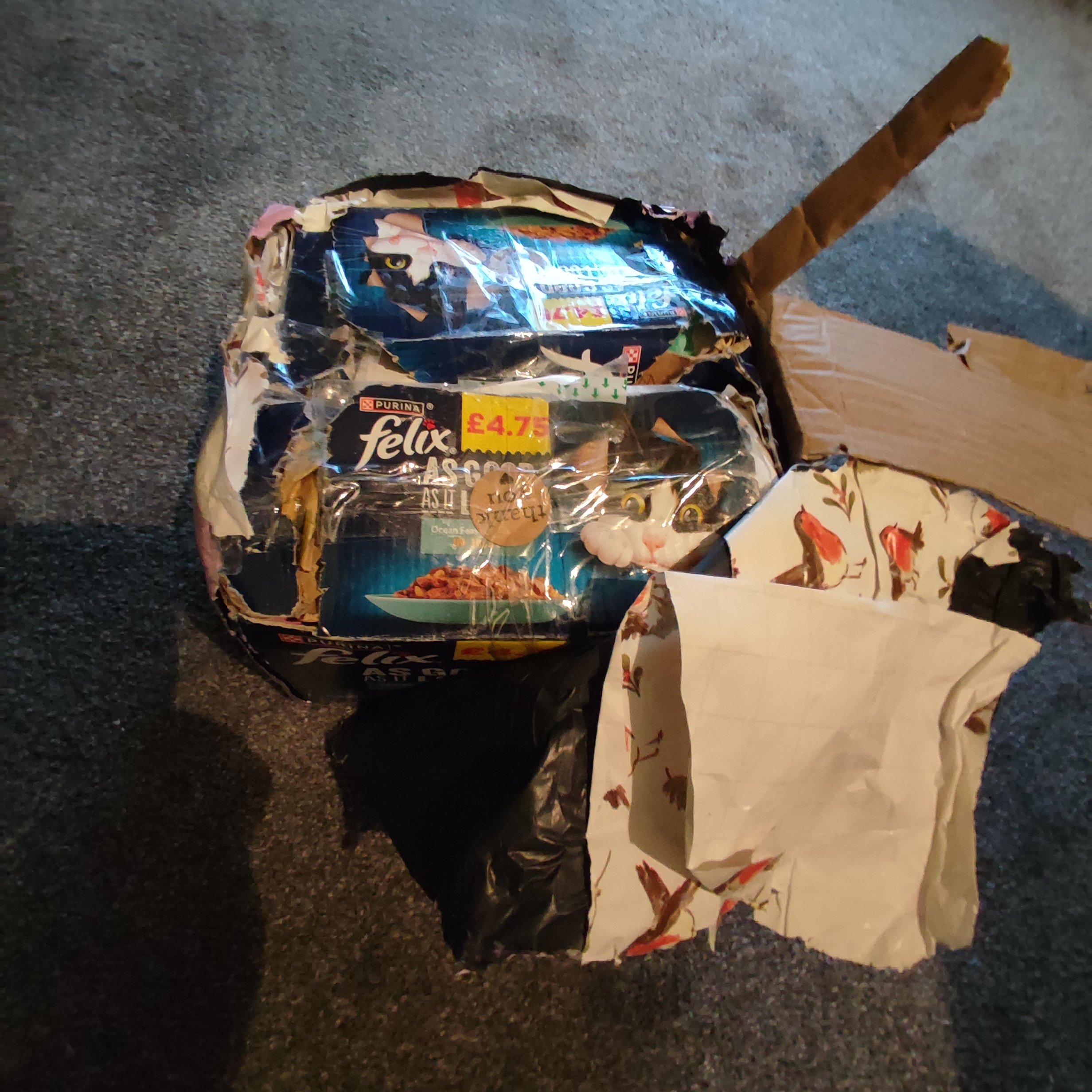 Time to break into the studiously taped together Felix cat food boxes. There appears to be red tissue paper, random white cardboard and brown wrapping paper inside.