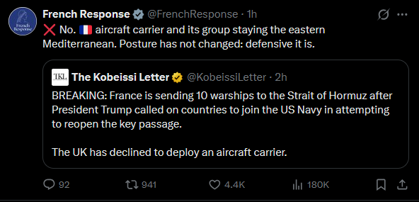 >>61984979>(We're not coming to help)doubtful, considering the hormuz block hurts the other countries way more than it hurts the USyou kinda need to intervene far more than we do. we are energy independent. You are not.as far as I know, france is already sending a fleet of 10 ships, not sure if that includes one of their super carriers.