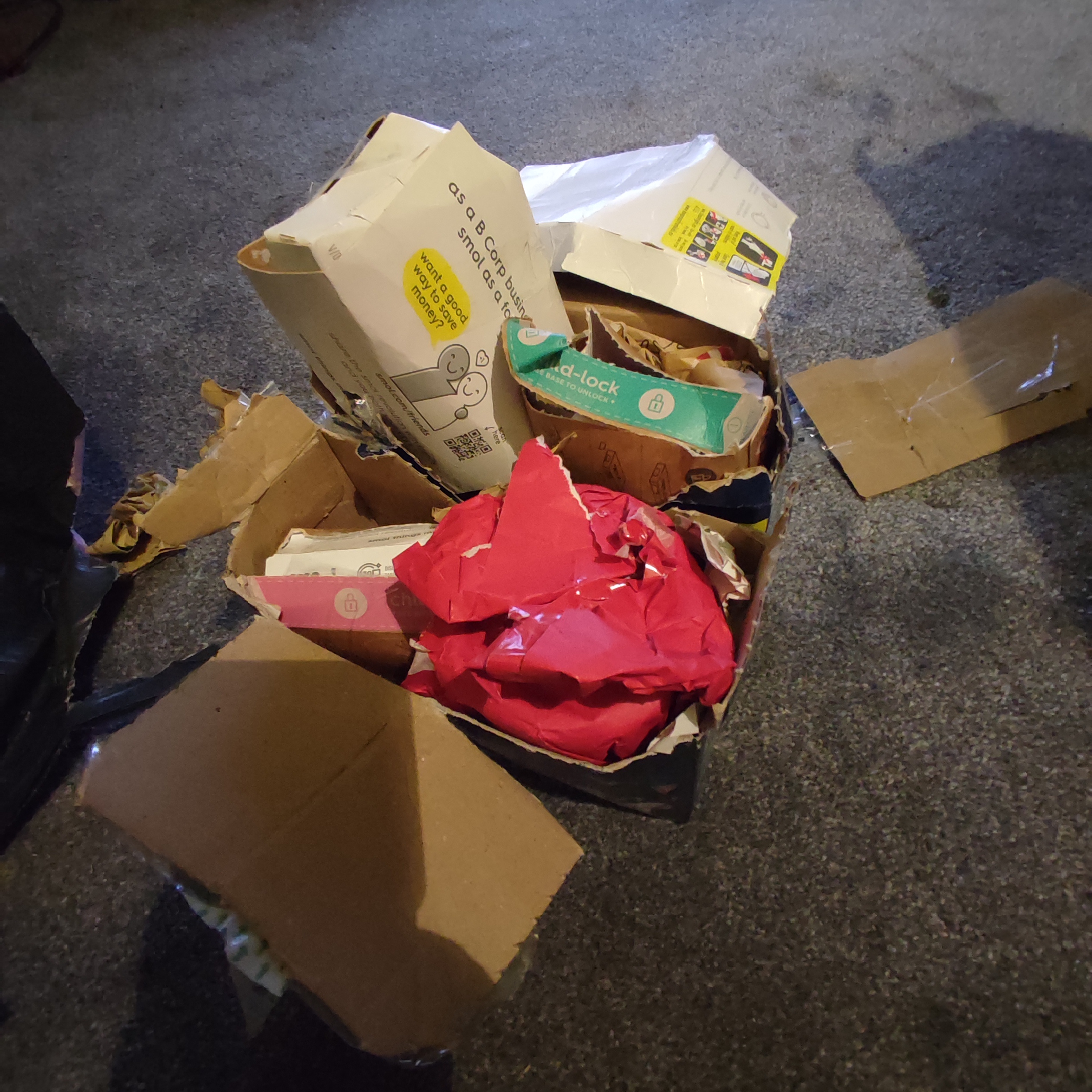 This is actually a tour de force of diversity packaging. Laundry capsule cardboard, red tissue paper, some weird child lock shit...Brown paper to make up the numbers.I've genuinely never seen anything like this. More tape.