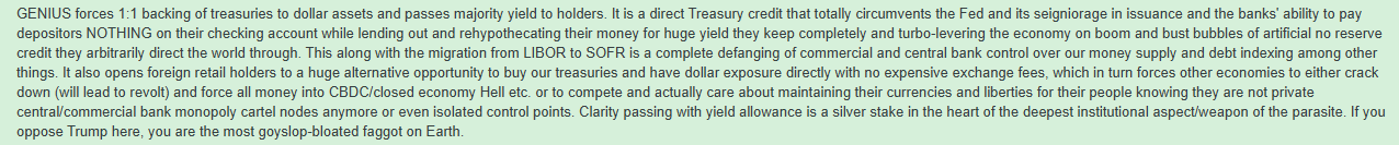 >>61989576>>61989614>>61989939>>61989950tldr; Really big, like depth of system depth level things are happening and shaping and while a lot in the middle and upper surface is frustrating and seeming to build like you say I think a lot of it is concessions that have helped build the depths which are unequivocal and not being sacrificed, the higher parts being litigatable more later. Right now Trump's coalition are blocking the bill amended to include the CBDC blocking provision after Elizabeth Warren tried to make it sunset in 2030. Trump attending the WEF and spitting in their face in 2017 and then recently and not articulating a synthesis from their antithesis but actually refuting them and reeling back to original is not him being owned just because he was there any more than him being granted access to the forbidden city in China is demonstration he is owned by China etc. and either way Ripple have nothing to do with it. I honestly am wondering lately if Trump is unknowingly being led astray by technocrats on some things to be sure but none of that has anything to do with Ripple and it is a fallacy to just toss it in because they have professional association with the WEF as do literally every major company, especially finance companies. If Ripple/XRP were/was evil I would not invest in it and it is definitely not xsg consensus that it is. It is xsg consensus that it is the standard that rebukes the parasite. I have avoided projects in the past and will continue to if their purpose or aim is evil. Ripple is the opposite for the reasons stated and many others.