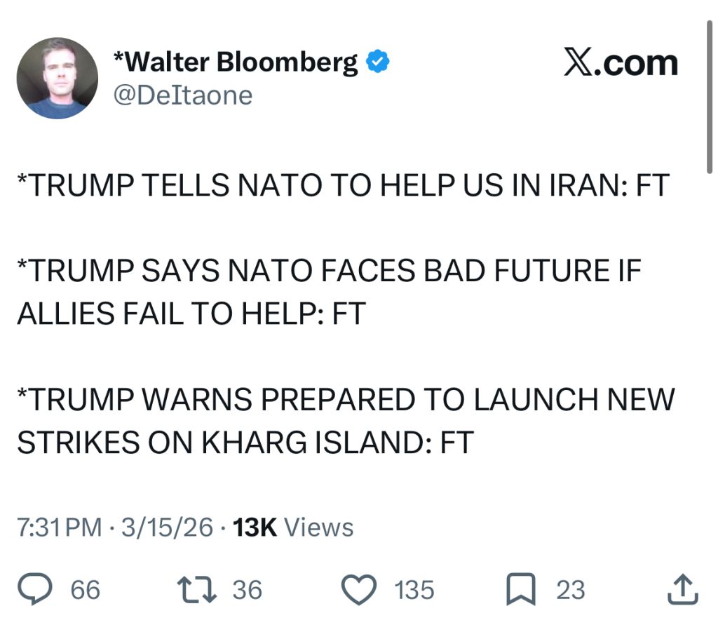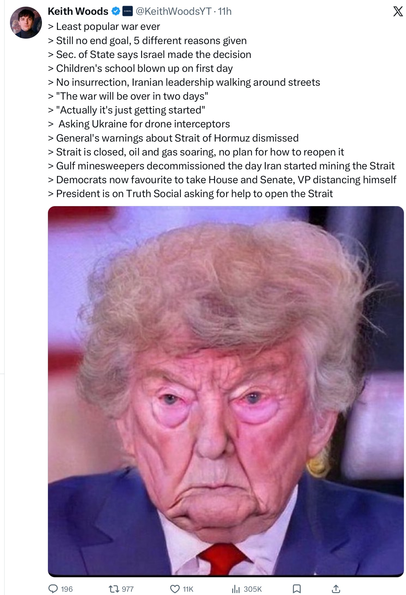 >>61989389>>61989394Logically think this through for any western allyOption A: Send your under funded and under equipped navy into this mission that was started by a war of aggression>Hugely unpopular domestically as are Israel and America>Significant chance of casualties and losing not easily replaceable equipment>Timeline for reopening the strait gets affected an unknown amount of time>You take forces away from regional threats you are more concerned to possibly lower oil prices a little bit quicker>Even if you do it, Trump will not consider that in trade negotiations as he's not a good faith negotiator. He's also on his way out so appealing to him doesn't actually matter. Basically any deal you make with him, he can and will change at any time, no point in doing anything but making vague promises Option B: Do nothing>Let America tank the costs of the war>Maybe more economic pain, but a great deal of economic pain is already baked in>Strait closure might be prolonged or it might force America to settle the conflict sooner if there is no allied support: timeline for reopening the strait gets affected an unknown amount of time>Reputation suffers with a political party and political movement that's on its way out of power in a few years anyways>Military and intelligence establishment and American public fully internalize was a strategic liability that their Israel support is, will pivot resources long term away from the Middle East and to Europe or AsiaWhat is the reason why anyone would help?