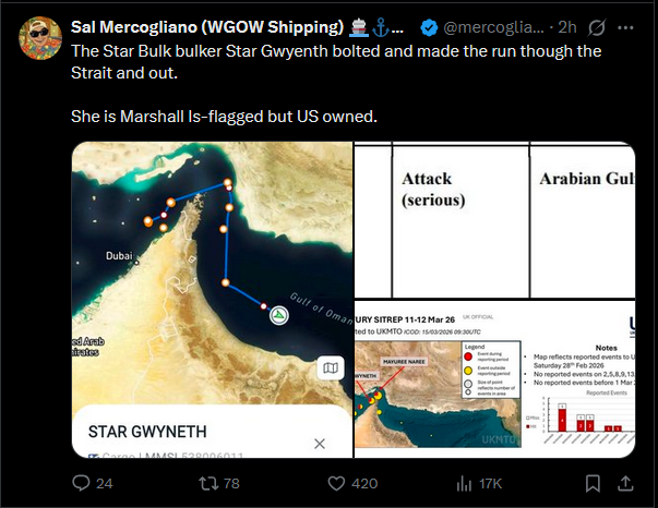 An American ship sailed through, was attacked and started listing but made it out