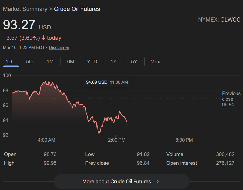 >>61992595The Treasury department said they were going to short oil before they tried to downplay it, and you can literally see them doing it on the WTI futures chart with the $100 sell wall. The CEO of the CME group was concerned enough to issue a public statement trying to get them to stop, and also last week Bessent got pulled out of an interview into the Whitehouse situation room, only to return looking extremely shook. They know that they fucked up by shorting oil under the assumption that it would be a brief oil shock that would lift before futures expiry, hence the unhinged israeli shilling about oil.