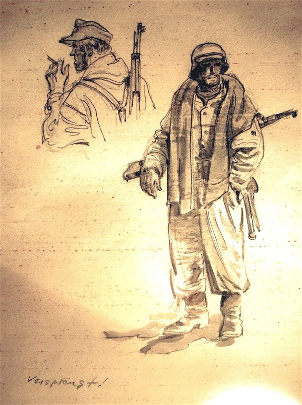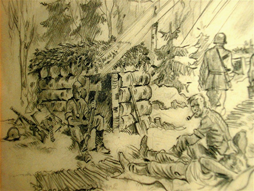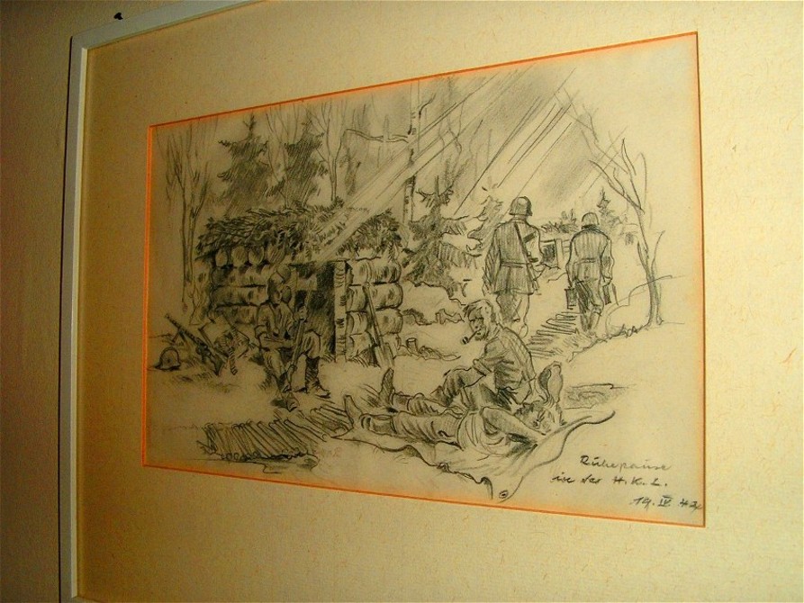 Aside from the condition, the pricing is based on context.The Tank Battle sketch would be top tierTime stamped encounter with added color pencil effects.Nothing better will ever come up for sale.Found 1 sketch for sale. Damaged, water stain not bad,random camp image. Tier 3/4€1,100 Found unrelated second piece post war paintingnot war related€2,500