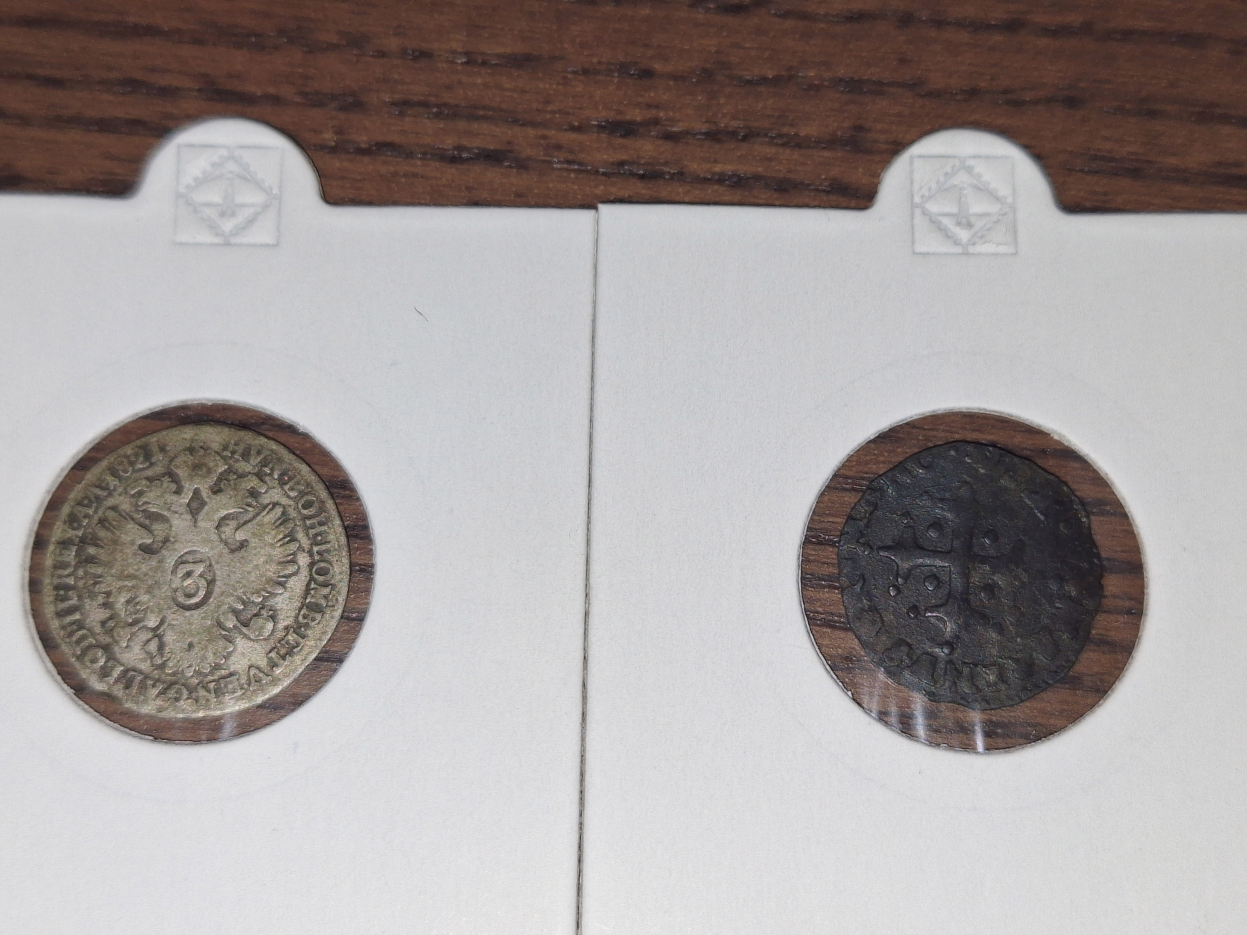 I found these 2 neat silver coins (billon) in some old binder today. The one on the left is a 3 kreuzer coin from the Austrian Empire, while the one on the right is a 1 Sesino from the Republic of Venice.