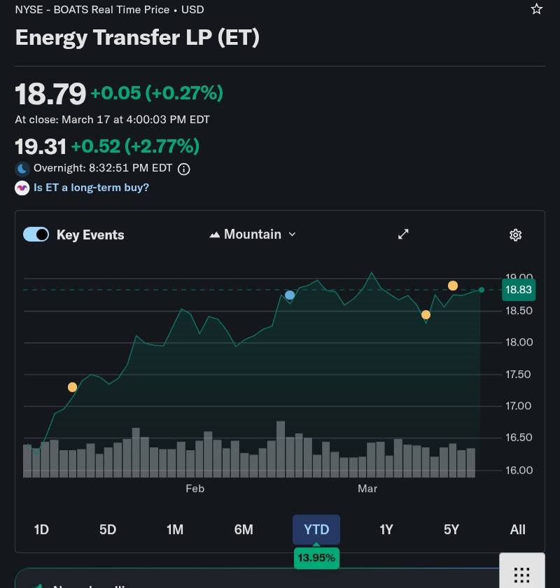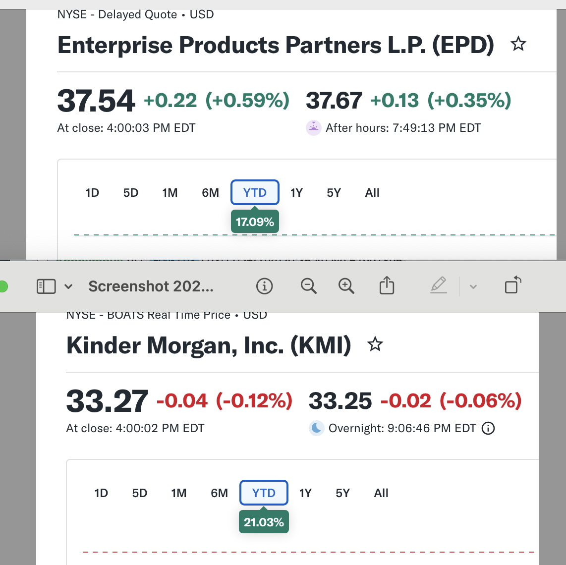 won't post more stock stuff after this>>61997908i also hold and like these two a good bit. epd is an mlp like et so you'll get a k1. slightly lower yield but higher div growth. kmi is regular c-corp so qualified divs but much lower yield
