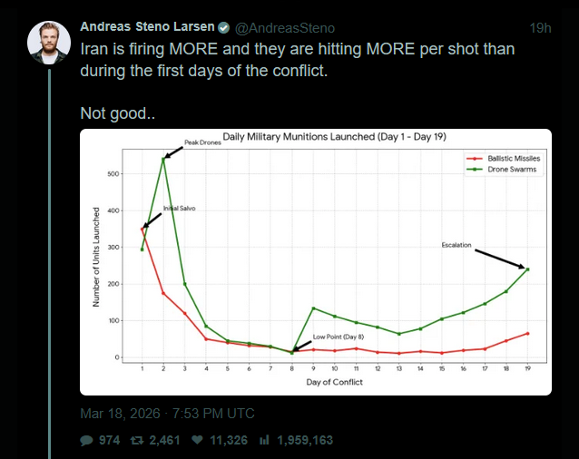 Meanwhile, US and Israel have minimal damage and casualties, while Iran is desperately attacking all of its neighbours, driving countries like Qatar away and closer to the US, as Qatar expels all members of Hamas and Hezbollah.