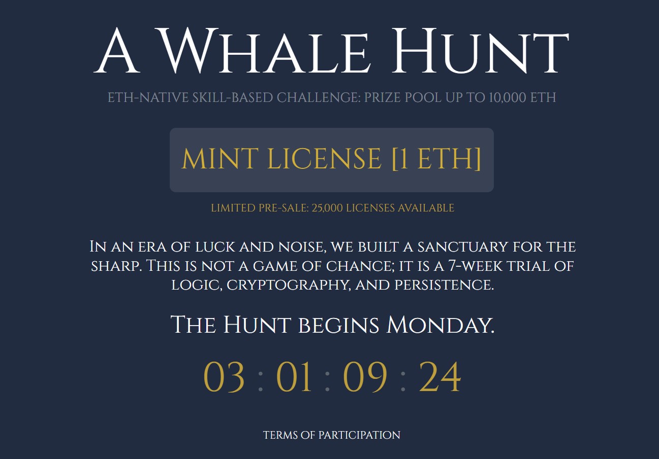 7-week intellectual quest.* Up to 10k ETH prize pool.* Pre-sale just started - 1 ETH - 25k Licenses only.* First enigma drops Monday.Check the contract/logic: https://awhalehunt.xyz