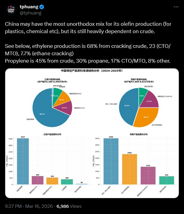 One additional thing to note is that Chinese petrochemical plants tend to be integrated with refineries, which means the input is crude oil rather than refined product. Crude oil from the Gulf is easier to substitute than naphtha from Gulf refineries