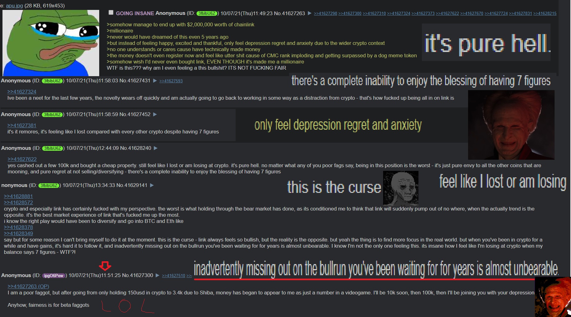 >>62015801why the fuck is everyone talking about chainlink. this thread is about my pain. Is LINK really just synonomous with pain? GG LINK faggot holders