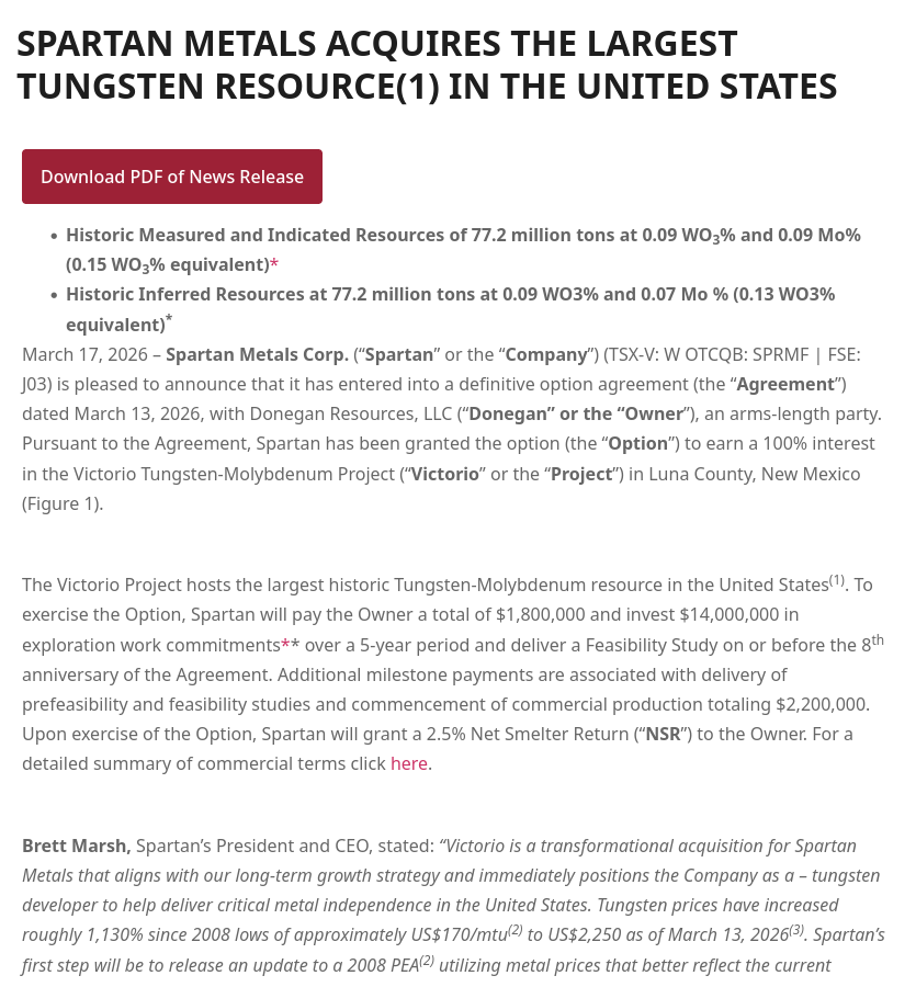 >>62015292Anyone wanting to get in on the tungsten, buy Spartan Metals. It's a miner that just acquired America's largest tungsten and molybdenum deposit in Nevada a few days after Trump attacked Iran, the price soared 60% and then dumped back down with the rest of the market.When the liquidity comes back to the market, this pennystock will become a multibagger.