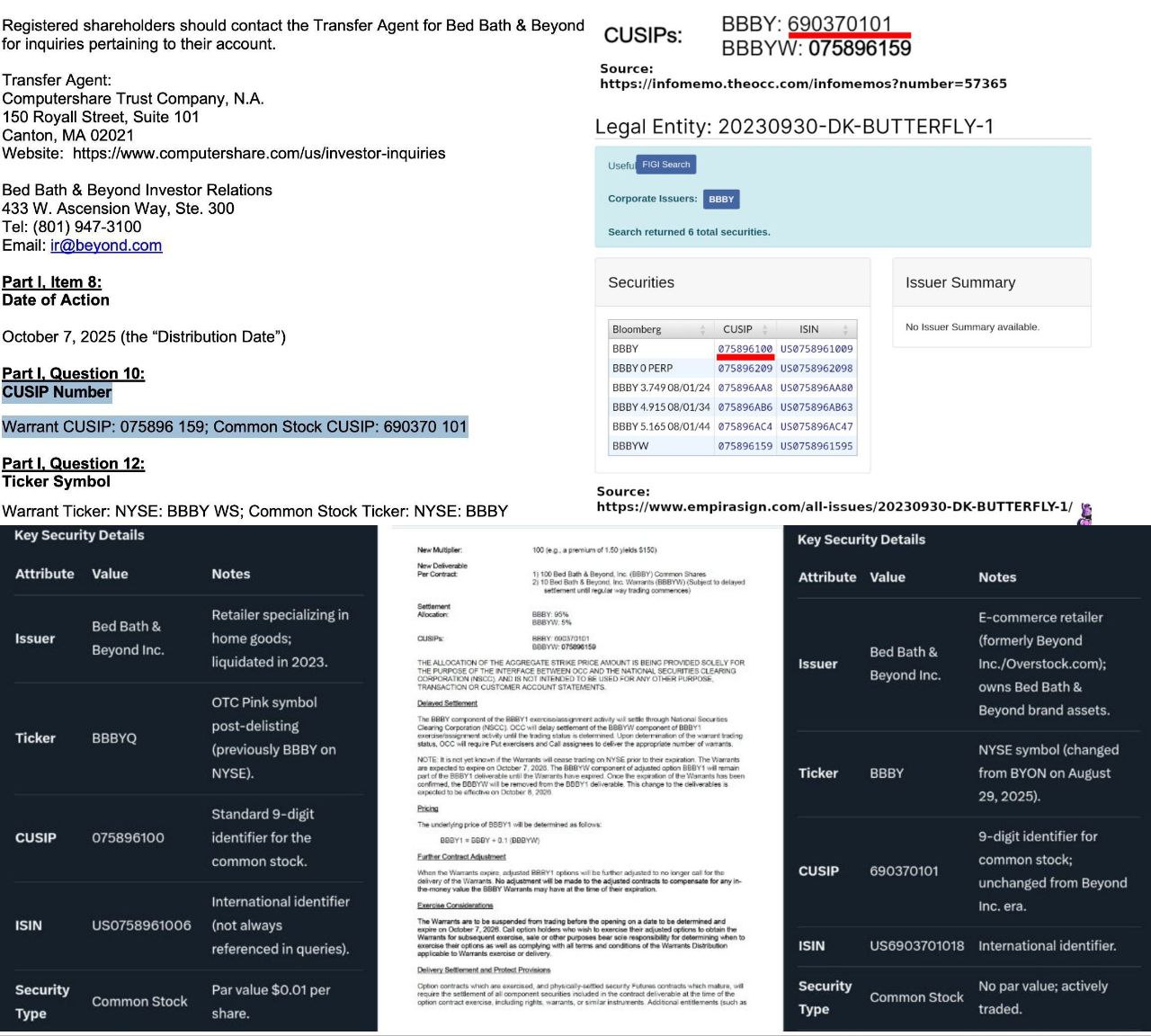 >>62016593the lower red underline shows the old ticker name of BBBY before the name change to BBBYQ and then 20230930-DK-Butterfly-1, Inc. A more up to date example of the CUSIP-6 conundrum is as follows:Bed Bath in June 30th 2020 before name change(now known as BBBYQ or DK-Butterfly-1), 13Ghttps://www.sec.gov/Archives/edgar/data/886158/000110465920082648/tv0003-bedbathbeyondinc.htmCUSIP: 075896100OverStock(now BBBY), December 31, 2019, 13Ghttps://www.sec.gov/Archives/edgar/data/1130713/000119312520035091/d885642dsc13ga.htmCUSIP: 690370101BBBY(now OverStock) September 30th 2025, "Bed Bath & Beyond Inc", 13Ghttps://www.sec.gov/Archives/edgar/data/1130713/000010290925000032/xslSCHEDULE_13G_X01/primary_doc.xmlCUSIP: 690370101BBBYW (BBBY warrants) Options Clearing Corporation filing:https://infomemo.theocc.com/infomemos?number=57365theocc.com is the official Options Clearing Corporation website.CUSIP (BBBY): 690370101CUSIP (BBBYW): 075896159BBBYW (BBBY warrants) official BBBY investor relations website:https://investors.beyond.com/resources/Warrants/default.aspxscroll down and you will see Form 8937 Tax Information, here is a direct link from the official BBBY investor relations website:https://s203.q4cdn.com/409549452/files/doc_downloads/2025/Form-8937-Warrant-and-Attachment.pdfWarrant CUSIP: 075896159Common Stock CUSIP: 690370101OFFICIAL filings that show the:BBBYQ(DK-Butterfly-1) CUSIP-6: 075896BBBY(OverStock) CUSIP-6: 690370BBBYW(BBBY Warrants) CUSIP-6: 075896