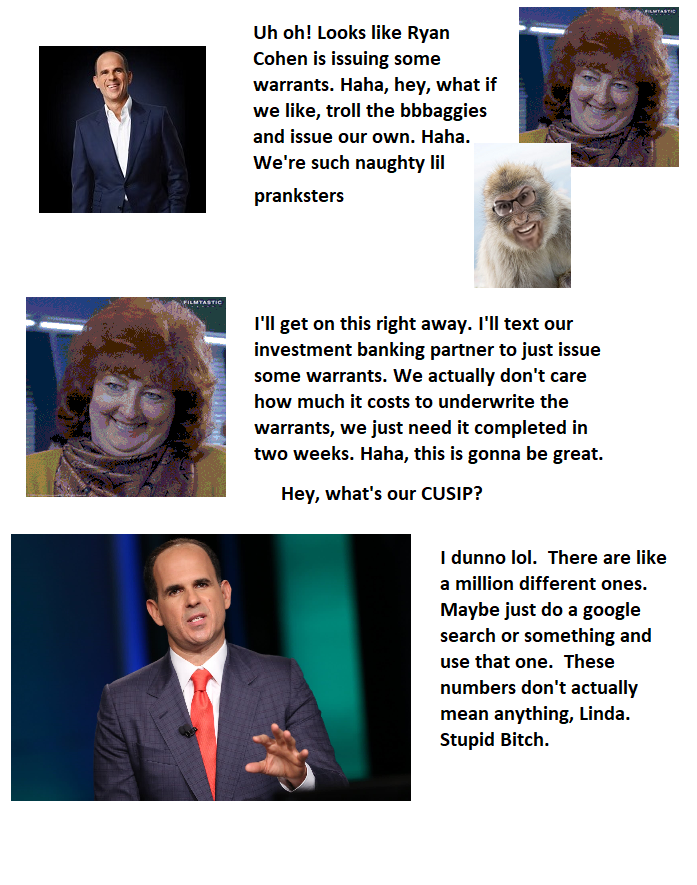 >>62016920I'm amazed shillgroids are still using this argument.>"Bro, have you ever considered that the obscure towel retailer would try and scam you by issuing warrants and epicly le troll you and the 12 random people with a combined net worth of like $10,000 who still actually follow this play?">"Yeah, it takes an inordinate amount of time and money to underwrite and issue these new securities to market, but think of the money they'll make off you! They might even make a couple thousand bucks!"How retarded do you have to be to think this is the reality? Pic rel as it's the initial argument shillies used against the CUSIP conundrum. Marcus Lemonis, le epic troller extraordinaire, decided to dunk on BBBYQ by issuing identical warrants to GME less than two weeks after GME issued theirs, and in doing so would capture the vast market that is the cross-section of GME holders and BBBYQ holders who still follow this bankruptcy (even though, by the admission of shillies, they believe BBBYQ holders don't actually hold GME). I'd love to see the analyst pitching this theory to the board.The arguments from the shillsisters are crumbling almost as fast as their gender identity.