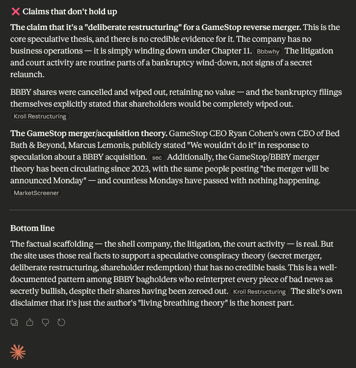 REQUIRED READING: bbbwhy.com>REQUIRED READING: bbbwhy.com REQUIRED READING: bbbwhy.com>REQUIRED READING: bbbwhy.com >rc buys 7,780,000 shares of BBBY, and $60-$80 strike calls worth 1,670,100 shares in March 2022>rc sells shares and calls of BBBY in august 2022>rc has a sitdown with a famous corporate raider, Carl Icahn in october 2022>rc offers 400 million for BBBY in December 2022>pitchbook (best M&A software suite in the world, costing 5 figures + per year) lists BBBY(now known as BBBYQ or DK-Butterfly-1) as sold in January 2023>one month later, February 2023 RC tweets “someone tell the government to stop shooting down my balloons”, alluding to bad actors delaying the Bed Bath m&a>Larry cheng (who helped RC build Chewy, and is a current boardmember at GameStop, and a close personal friend to RC) went onto theppshow podcast (which is dedicated to BBBY recovery theories) 8 months after BBBY filed for chapter 11, and 2 months after shares were cancelled>OverStock - who is the most famous company to battle illegal naked shorts, who even released a crypto dividend 5 years ago - purchased the BBBY IP, and owns 55% of the only approved blockchain entity who can issue debt instruments and securities>OverStock - whos now traded under ticker BBBY - has issued warrants with dates that match GME's warrants, and with a CUSIP-6 that is shared by BBBYQ, proving BBBYQ is not a simple liquidationBBBYQ(DK-Butterfly-1), BBBY(OverStock) and GME are going to be restructuring in some way. Both GME's and BBBY's warrants are a dead giveaway.Last time on /BBBYQ/: >>61997652As always:>sneed maxipads