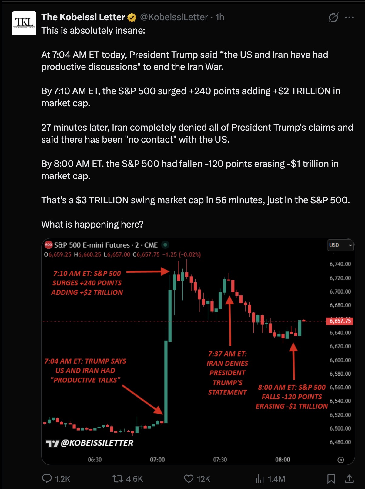 No negotiations have taken place ..Iranians have already said it's bullshit..but this is really interesting how trump can manipulate markets with stories like this