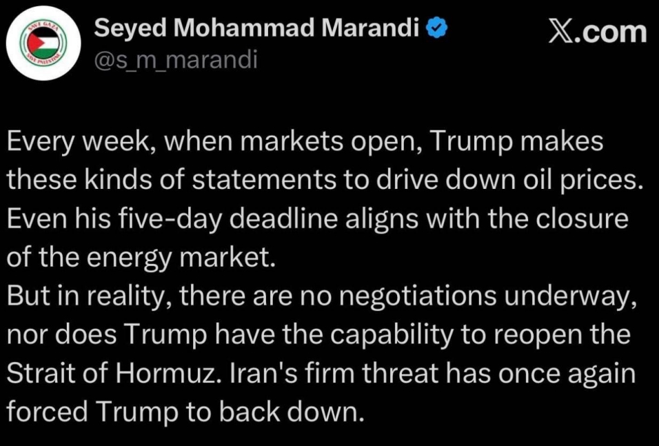 >>62021384I agree, it's not over yet by any means but Trump announcing his weekly TACO to the world this morning is a short term relief and in itself contributes to the feeling that escalation is being avoided.