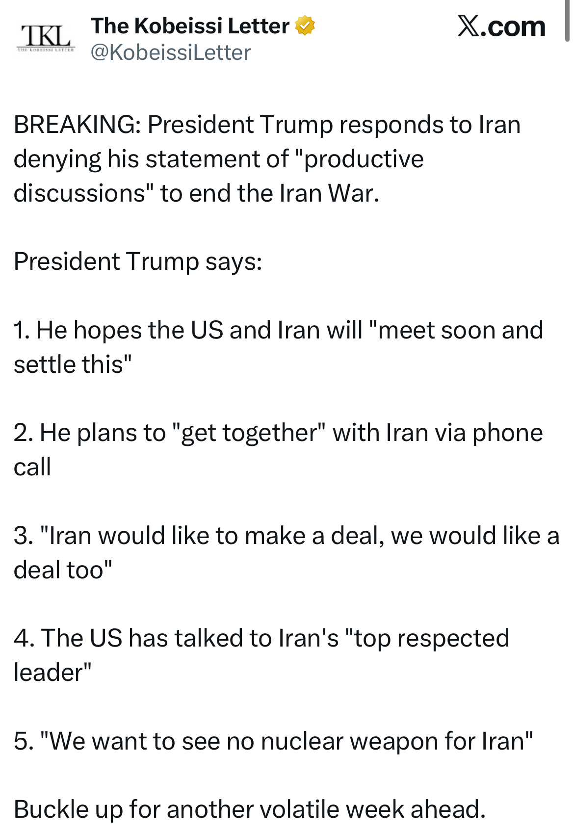 Does anyone else think he’s stalling until troops are in position to take Kharg? They have 0 leverage without it