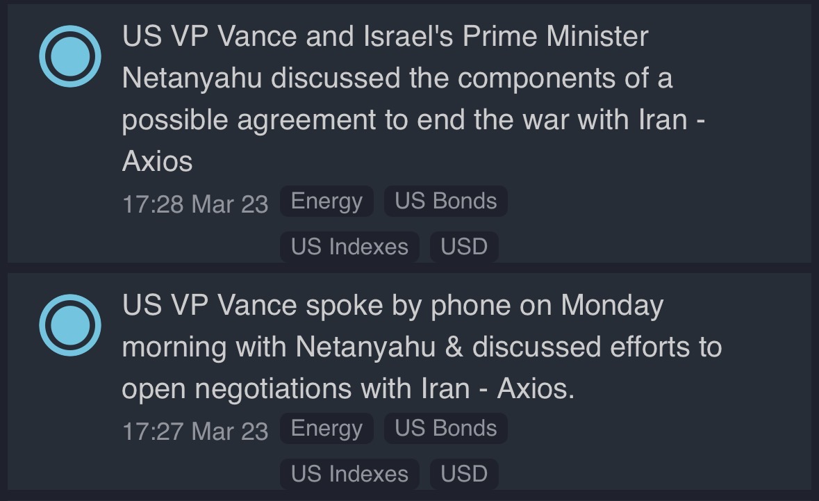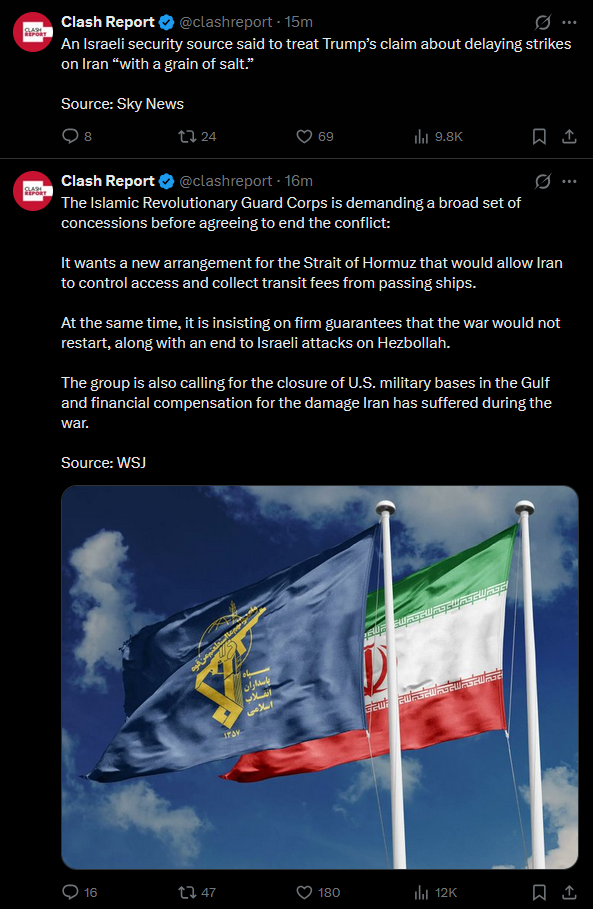 Whether Trump made it up or not (he obviously made it up), the bullish point is he climbed down from his ultimatum. So there's no escalation to blowing up power plants. However there's still the problem of the Strait being closed. And it's totally up to Iran whether and how it's opened again, since Trump has just demonstrated to the world that Iran holds all the cards here and that America will not follow through on any threat or ultimatum.