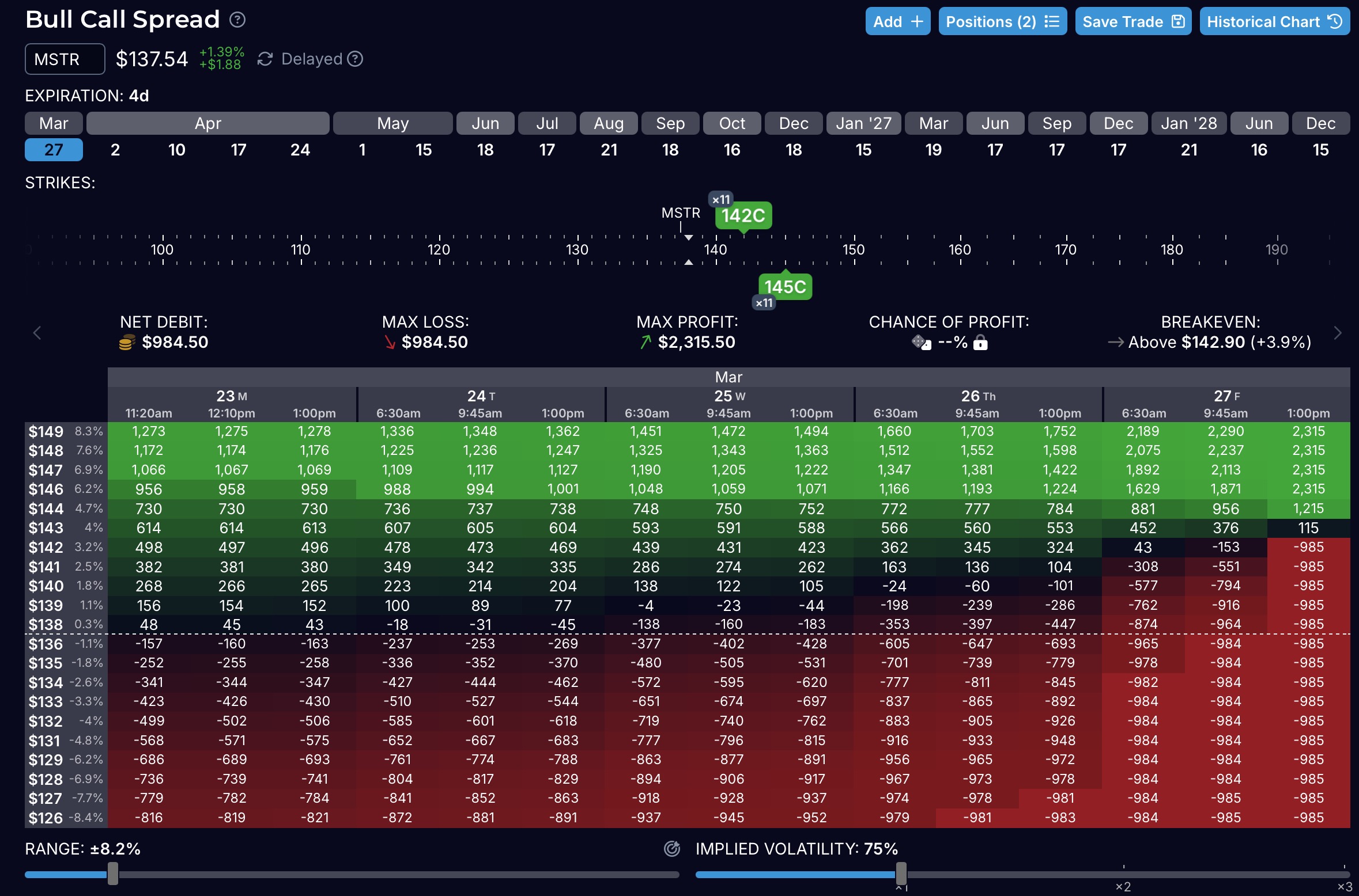 >>62023113Long 142C: $2.0186, short 145C: $1.3086. Yeah the spread was pretty narrow, I didn't care to capture upside beyond $145, since I see it being unlikely this week so it let me reduce the total risk/position size but keep the reward I wanted.