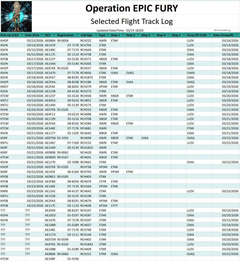 >BREAKING NEWA significant movement is underway from US Army, Navy and Air Force bases in CONUS to the Middle East comprised of at least 35 C-17 flights since March 12th, with 11 more flights on the way.Origins:12-Hunter Army Air Field/Fort Stewart, GA8-Unknown7-JB Lewis-McChord, WA6-Pope Army Air Field/Fort Bragg, NC4-Campbell Army Airfield/Fort Campbell, KY4-Gray Army Airfield/JB Lewis-McChord, WA4-Naval Air Station Oceana, VA1-MacDill AFB, FL1-JB McGuire-Dix-Lakehurst, NJDestinations:17-Ovda Air Base, Israel13-King Faisal Air Base, Jordan4-King Hussein Int'l Airport, Jordan> OSINT Defender (https://x.com/sentdefender/status/2036153038906196133?s=20): Deployment of the 82nd Airborne Division from Ft. Bragg, as well as other units with the U.S. Army, appear to now be underway from bases within the Continental United States towards the Middle East, as staging continues for potential ground operations in Iran.