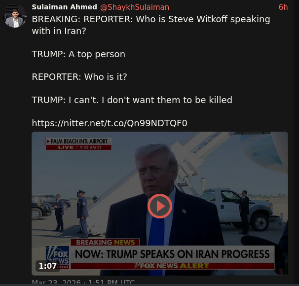 Iran just has to hold out until the US regime change in 6 months lmao, they won't negotiate anything now.In fact, they don't even have to xait that long, we are at day 24 of the 60 days (extensible +30) special military operation. Almost at the half of it.