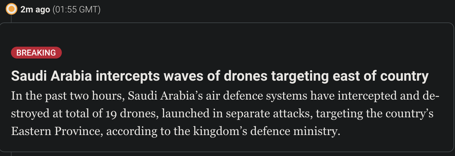 Things are escalating again. Earlier they said Saudi would never ship oil from the red sea again.....Iran is claiming the energy ceasefire is breached.