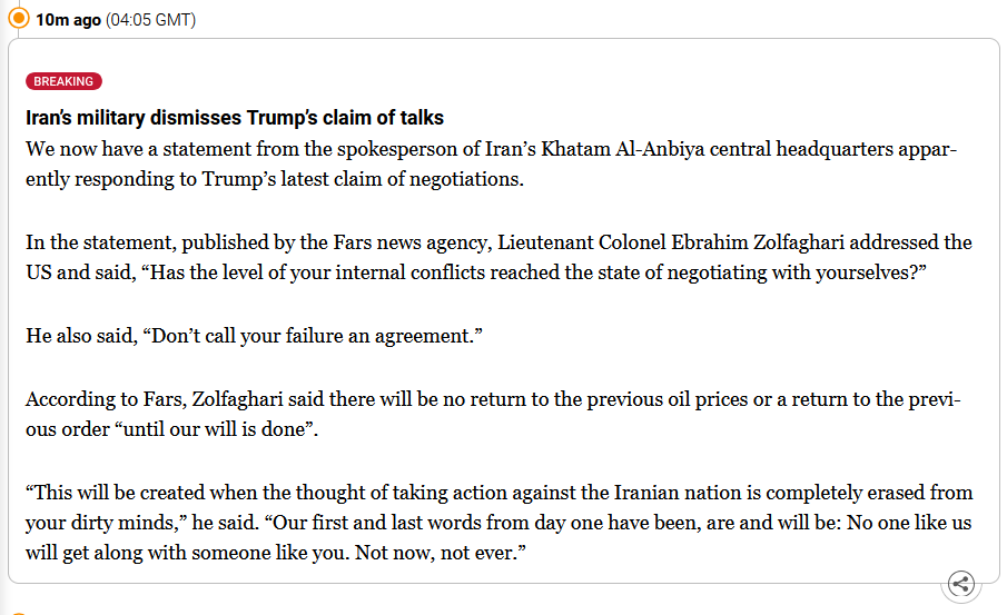 >Do not call your defeat an agreement, there will be no trace of your investments in the region, nor will you see previous energy and oil prices.” - Spokesperson for Iran's Central Military CommandBig talk.