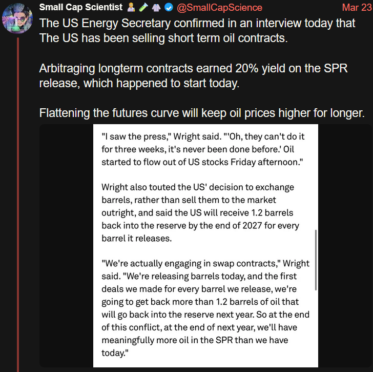 >>62029847>I feel like you're too stupid to even read what the shitter poster is complaining about so you don't have an opinion on what he's saying.No, I read the post and the guy doesn't understand the actual point being made, and chose to post clickbait. Then whoever posted it here was responding to the clickbait summary of the actual point.No, the us treasury department was not "shorting the oil market" to drive the price downThey were doing a price arbitrage, with futures contracts a year from nowBecause those prices were and still are FAR less than the price todayand the treasury department calculated they could refill the reserve with 1.2x barrels they released today, if they did thatThat's all they did. They are just betting that the price of oil will be less than 100 or whatever in 12 months, which everyone else was betting and still is betting. They are taking advantage of that. It's smart. How is this complicated?
