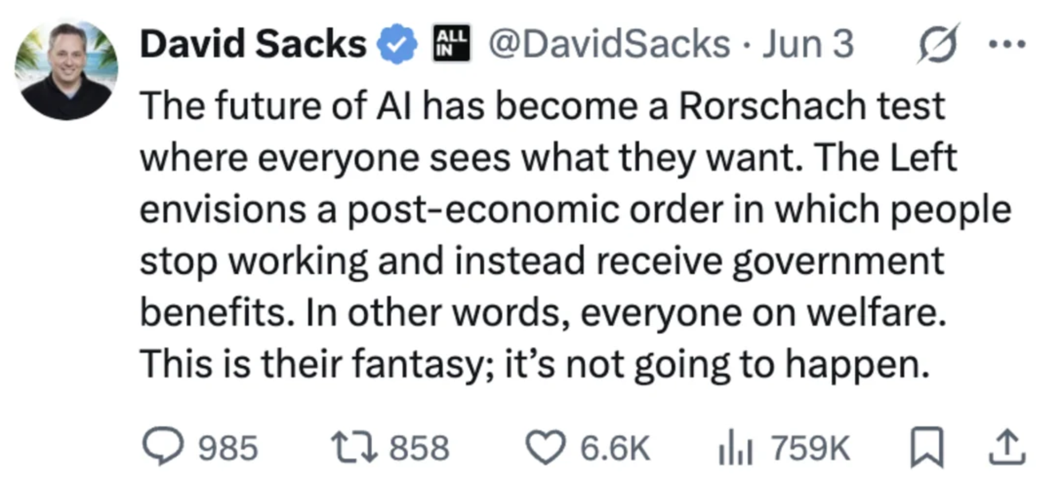 >>62029844>>62029859I mean, you'd think they'd at least try to make AI "tasteful" to the people. Instead he only goes on to deny the historically ultimate positive/beneficial argument for machinery and automation and with that leaves open all the other dystopian options which we can assume also actually is his goal.But MAGA will love it, because the evil left wants the other thing.