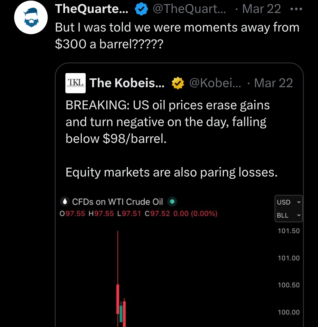 Literally nobody said we were "moments away" from $300/barrel, but if the conflict continues, we would easily see $200+ per barrel. US oil prices are artificially depressed. Fuck this fat shill.