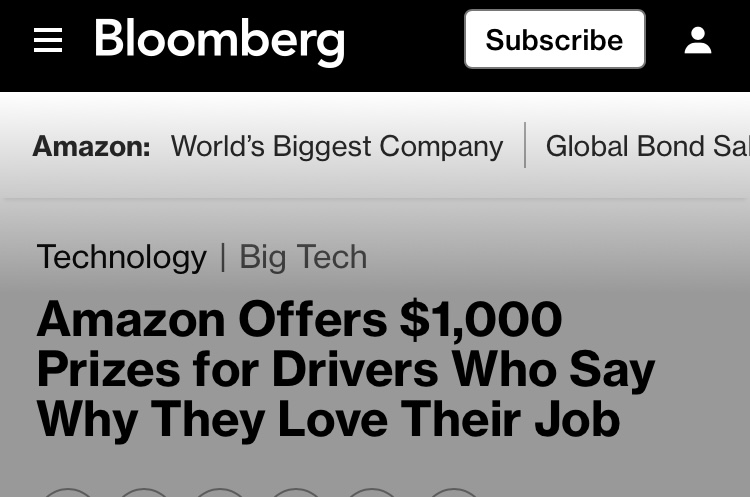 >>62035544>One hundred contest participants will receive $1,000 cash prizes, the company has told workers. The top 10 winners will also each receive a “VIP experience” for themselves and a guest. Before making their submissions, which are due by March 28, drivers are asked to consent to having their words and image “used by Amazon in external and internal communications” and to agree to take part in “any required media activity.” Workers have the option to withdraw their consent, Amazon said.>contest