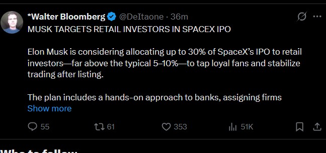 >>62036036>>62036118It's all engineered. Spacex has historically drastically undervalued itself in private offerings (In terms of public market value. Spacex is like Tesla in that it will likely be completely decoupled from earnings) so it makes sense that they would pick a market downturn to debut in order to soften the initial upward trend to avoid any negative press about profiteering. If you do the math using listed stocks and ETFs with large Spacex holdings like Echostar and DXYZ you'll find that the public values Spacex anywhere between $2.5 and $3 trillion. Debuting in a bear market at $2 trillion is just a way for Spacex to soften the on-ramp to avoid panic sales. To be clear, I'm not necessarily a fan of Elon or particularly fanatical about Spacex. I just understand the market psychology that drives Tesla's valuation and am willing to use it to make money without judgement. >>62036785Usually the time to buy is a month or so after the employee lockup ends because everyone sells and the price dumps for ~6 months before picking back up. Unclear if Spacex will enforce a lockup though so who knows.
