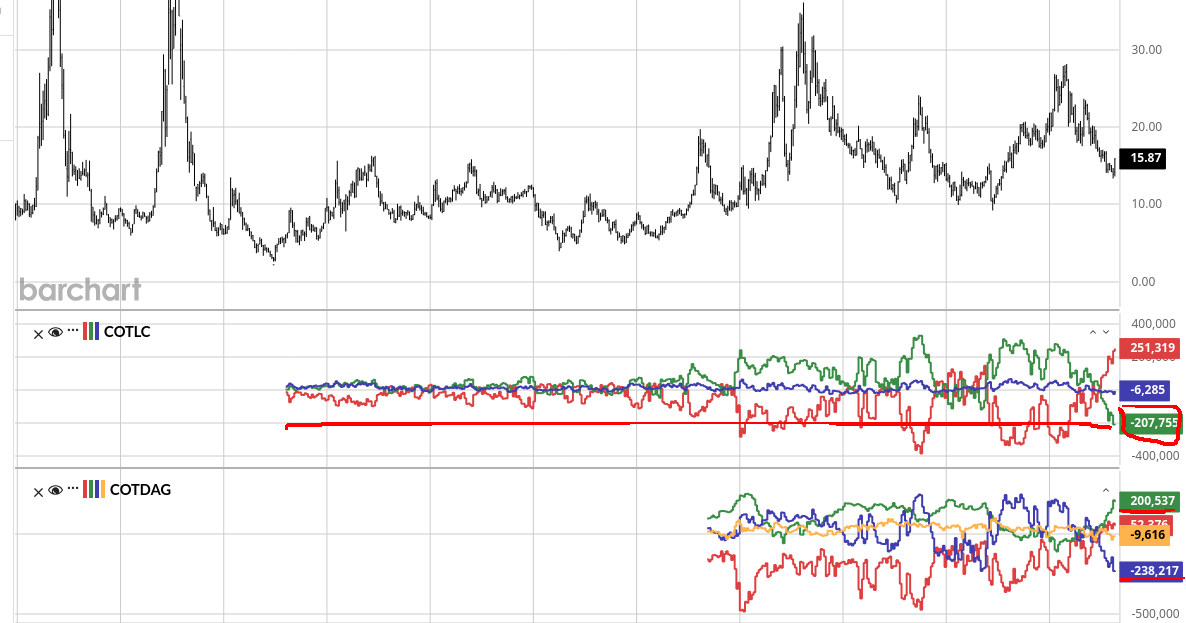 >>62037105green is speculator positioning in futuresby far most shorted everblue on bottom is money managers, green is dealers. dealers long = everyone wants to shortred on both is producer hedging activity